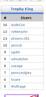 thx ... kannst du mir noch die SQL Struktur zeigen, da kannst mir nen screenie von der db oder die SQL befehle schreiben. Da ich nicht weiß wie unter welchem Eintrag sich die Trophäenanzahl befindet.