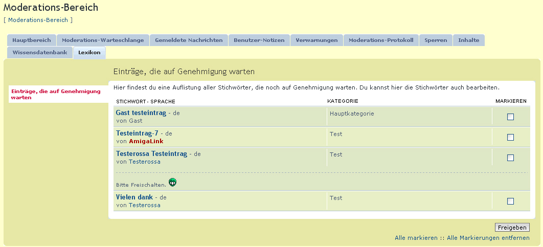 Hier mal ein paar Bilder vom Eintragsformular (mit deaktivierten Smilies) und dem MCP zum freischalten von wartenden Einträgen: