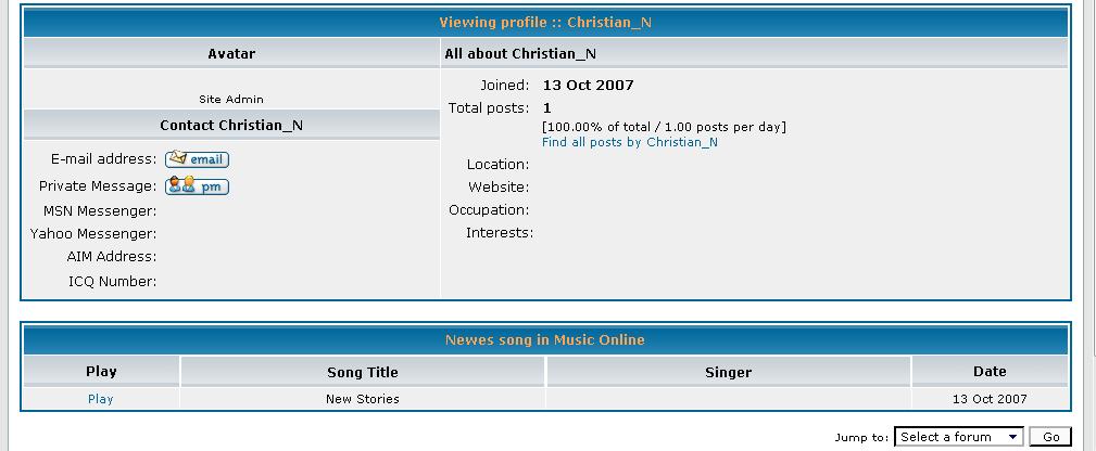 Aso ok ich schau mal :) denk mal am beste unter den Link "Alle Beiträge von Christian_N anzeigen" der im Profil ist am beste es dann anfügen mit "Alle Lieder von Christian_N anzeigen" oder so ähnlich dann. Wo dann eben auf die music_list.php weitergeleidet wird. :)
