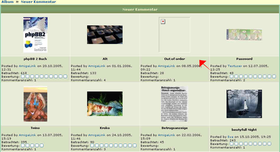Die album_thumbnail.php wiederum überprüft die Berechtigung und gibt gegebenenfalls eine Fehlermeldung aus. Diese Fehlermeldung führt dann zu dem berühmten roten Kreuz im IE und beim FireFox wird dann einfach garnichts angezeigt!